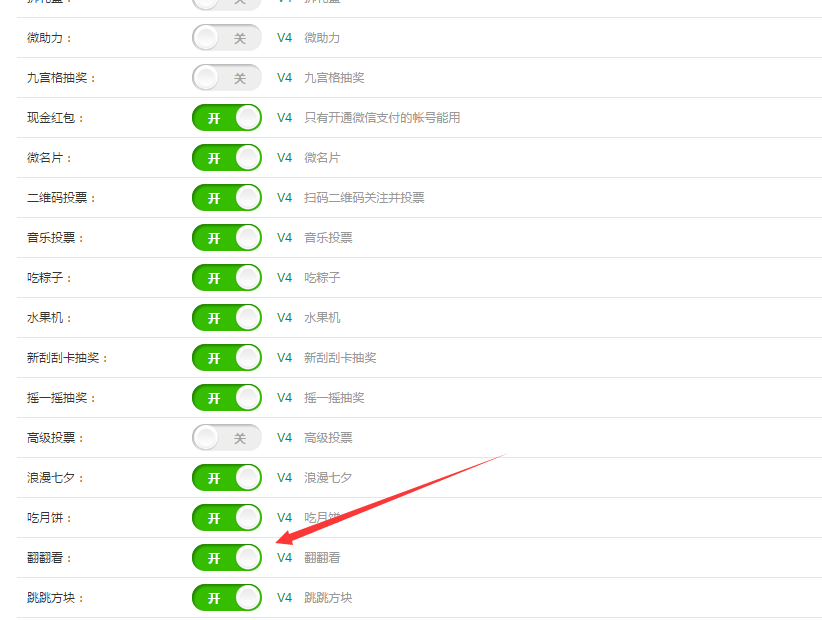 操作步骤:基础配置-->功能管理-->微活动-->翻翻看功能开关按钮-->开启